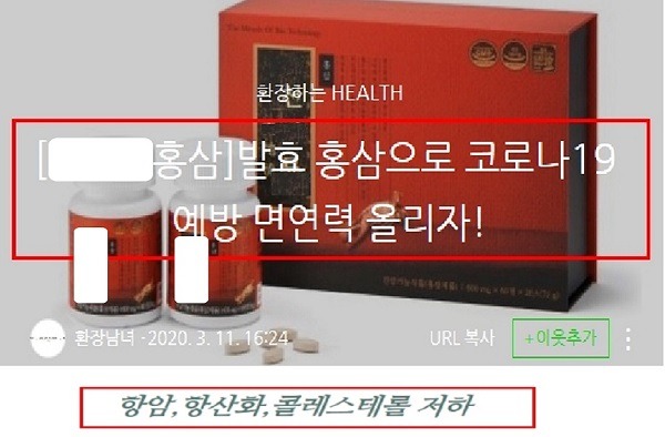 홍삼과 비타민 등이 코로나19 예방과 치료효과가 있는 것처럼 온라인에서 허위·과대 광고한 사례가 972건 적발됐다. 해당 판매 사이트는 차단 및 삭제 조치됐다.