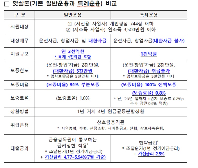 현행 사업자를 대상으로 하는 햇살론은 지역신용보증재단이 보증비율 95%, 보증료율 1% 조건으로 보증서를 발급하면, 저축은행 등 서민금융회사가 9% 내외의 금리로 대출을 시행해 왔다.