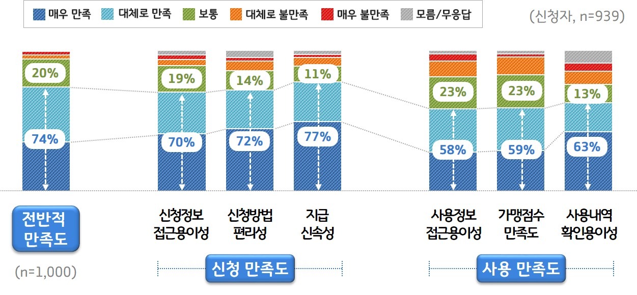 세부속성별 만족률을 비교해보면, ▲지급 신속성(77%) ▲신청방법 편리성(72%) ▲신청정보 접근용이성(70%) 등에 대한 만족률이 높은 반면, ▲사용정보 접근 용이성(58%) ▲가맹점수 만족도(59%) 등은 상대적으로 낮았다.