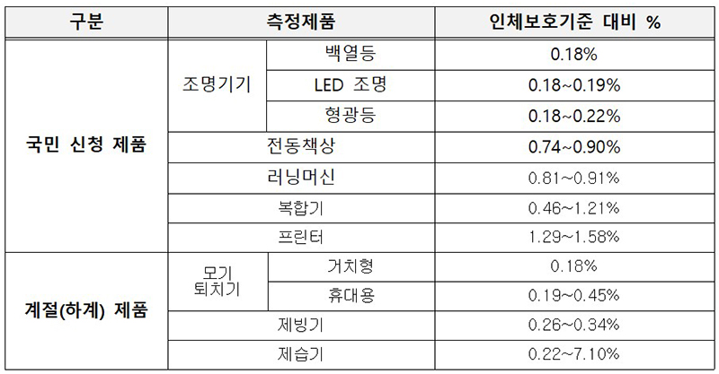 조명기기류와 러닝머신 등 국민들이 신청한 제품 7종과 모기퇴치기, 제빙기 등 하계계절 제품 3종에 대한 전자파 노출량을 측정한 결과, 모두 인체보호기준을 만족한 것으로 나타났다.
