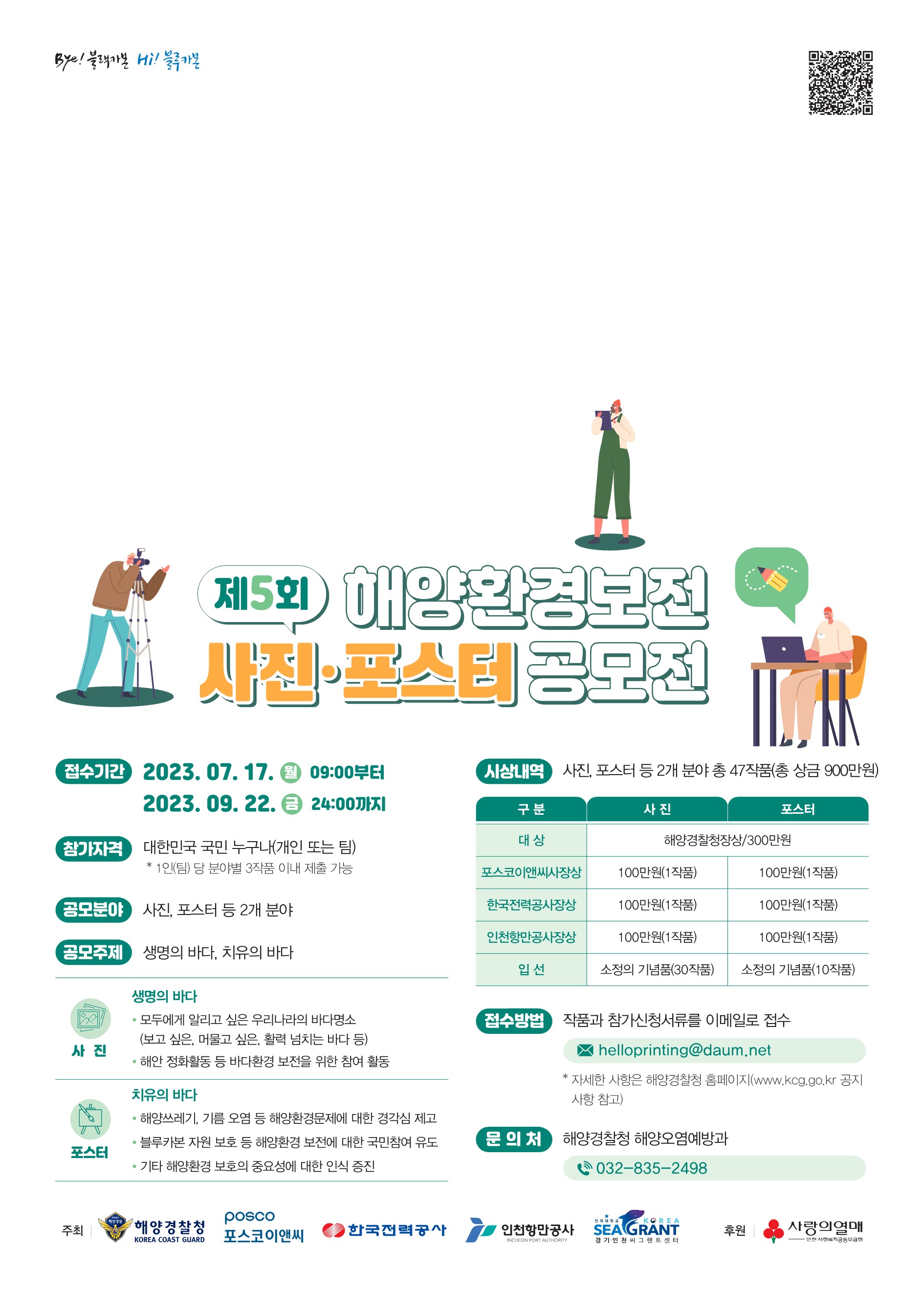 해양경찰청은 “포스코이앤씨, 한국전력공사, 인천항만공사, 경기·인천 씨그랜트센터 등과 함께 오늘부터 9월 22일까지 ‘해양환경 보전 사진·포스터 공모전’을 개최한다.”고 17일 밝혔다.