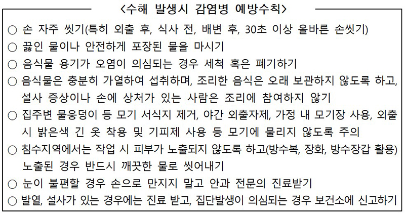 한편 풍수해 감염병은 ▲오염된 물이나 음식 섭취로 인한 수인성·식품매개 감염병(장티푸스, 세균성 이질, A형간염, 장관감염증 등) ▲모기 증식이 쉬운 환경 조성으로 인한 모기매개 감염병(말라리아, 일본뇌염) ▲오염된 물 등에 직접 노출로 인한 접촉성 피부염, 파상풍, 렙토스피라증, 안과 질환 등이 있다.