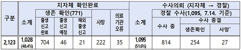 먼저 지자체는 총 2123명 중 1028명(48.4%) 아동의 생존·사망 등을 확인했다.