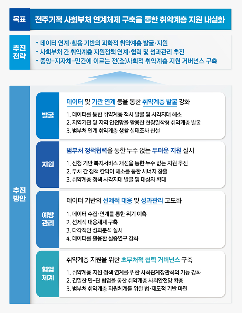 정부는 사회보장 빅데이터 등 취약계층 발굴을 위한 데이터 연계 및 실태조사를 추진하고 취약계층 발굴·지원을 위한 지역기관 간 연계 등 지역 안전망을 강화한다.