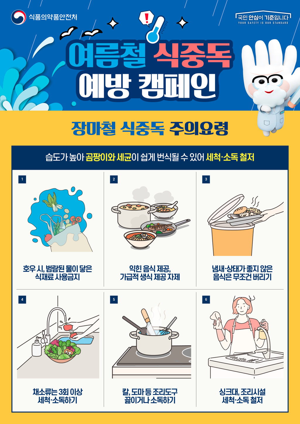 아울러 식약처는 올해 여름은 평년보다 장마철 강수량이 많다는 기상예보에 따라 식중독 예방을 위해서는 손씻기, 익혀 먹기 등 식중독 예방 수칙 * 을 준수하는 것이 중요하다고 강조했다.
