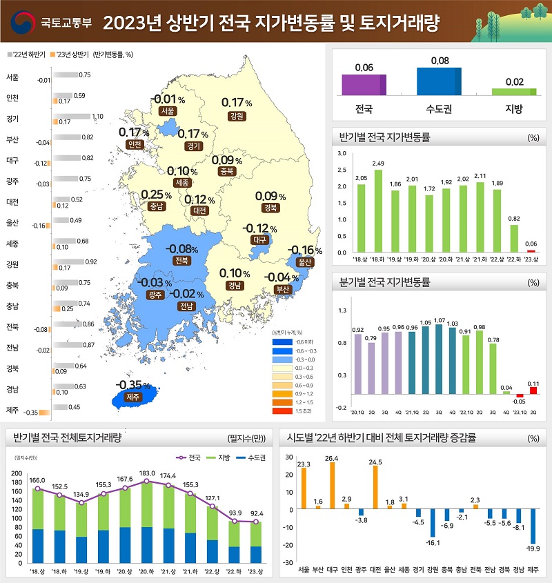 국토교통부가 25일 발표한 ‘상반기 전국 지가상승률 및 토지거래량’에 따르면 상반기 전국 지가는 0.06% 상승한 것으로 집계됐다. 이는 2010년 하반기(0.059%) 이후 12년 6개월 만에 가장 낮은 수준이다. 지난해 하반기(0.82%) 대비 0.76%포인트, 지난해 상반기(1.89%)보다는 1.83%포인트 떨어졌다.