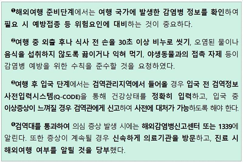 또한 여행 중에는 감염예방을 위해 손 씻기, 기침 예절 지키기 등 개인위생을 철저히 준수해야 한다.