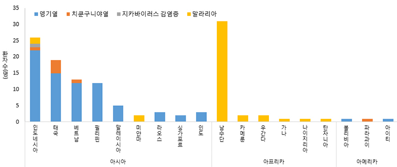 이 중 뎅기열과 말라리아 환자가 106명으로 대부분을 차지했는데 국가별로는 남수단, 인도네시아, 태국, 베트남, 필리핀 순으로 유입됐다.