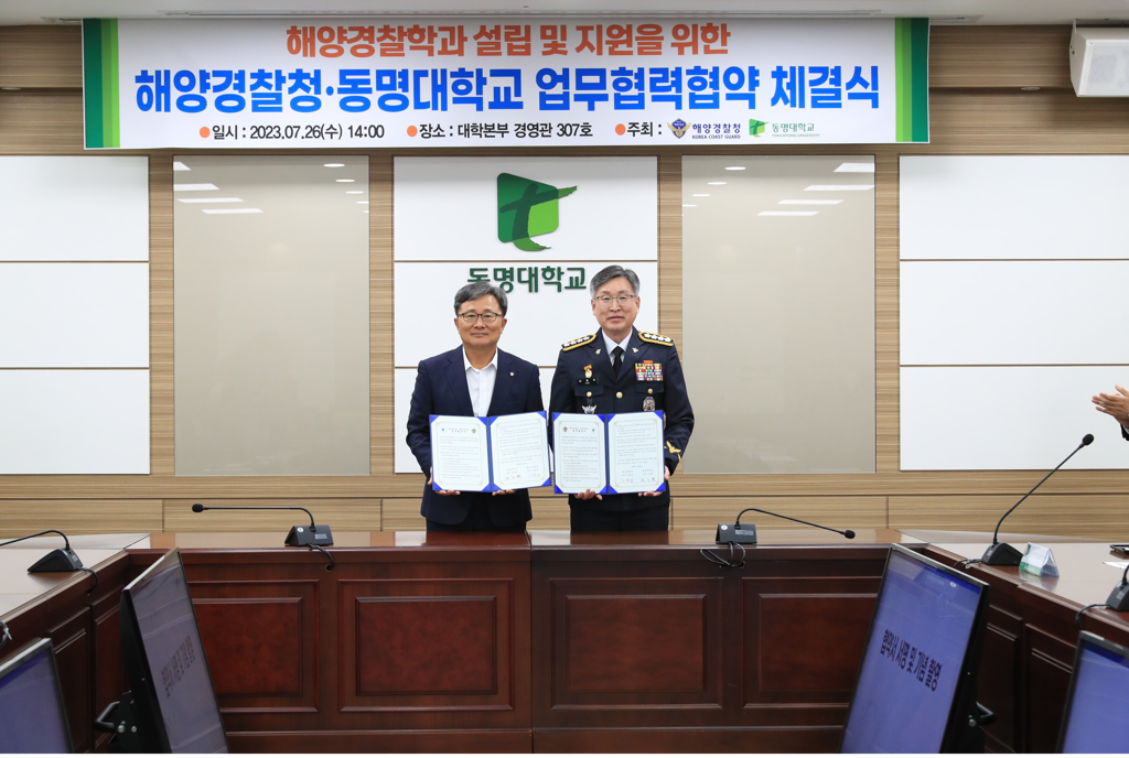 해양경찰청은 동명대학교에서 업무협약을 맺고 해양 전문 인재 양성과 학술교류 확대를 위해 상호 협력하기로 26일 밝혔다.