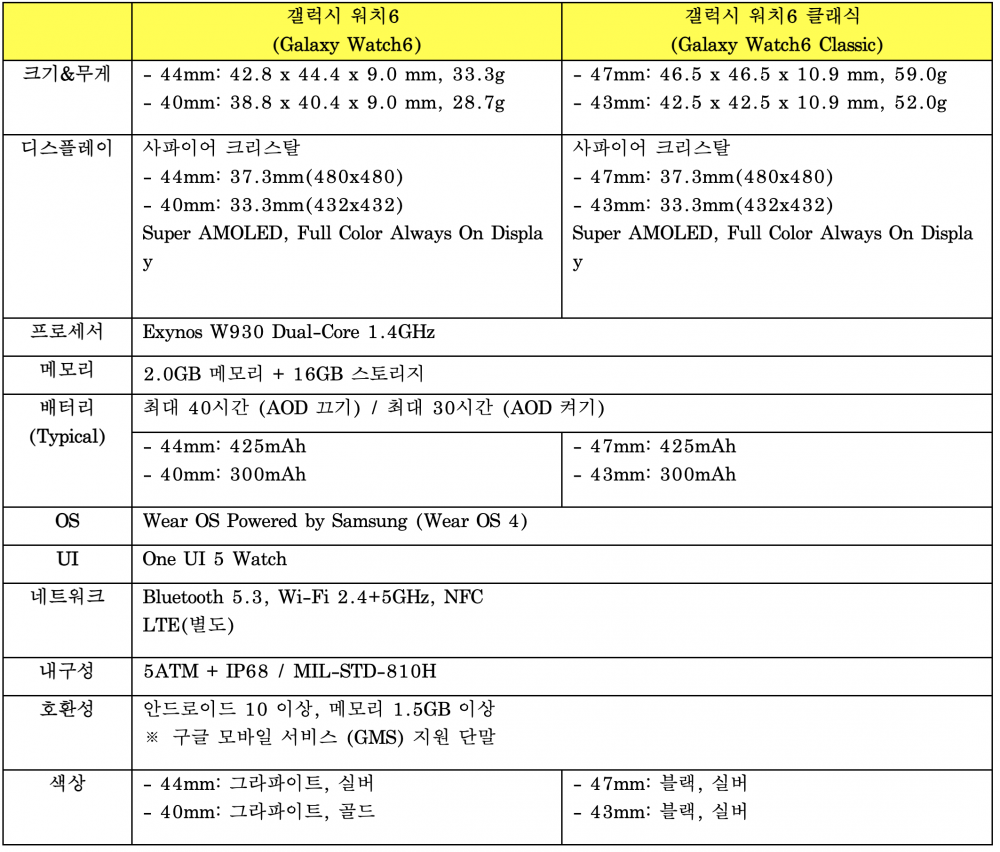 ‘갤럭시 워치6 클래식’은 47mm 모델과 43mm 모델 2종이며, 공통적으로 블랙과 실버 색상으로 출시된다.