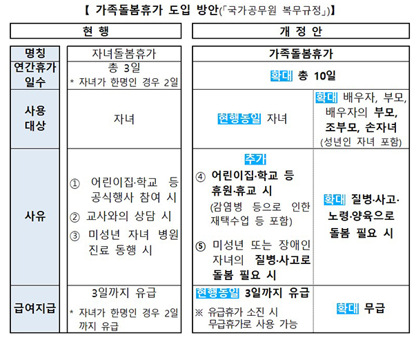 이렇게되면 공무원은 자녀뿐 아니라 배우자와 부모(배우자의 부모 포함), 조부모, 손자녀를 돌봐야 하는 경우 특별휴가인 가족돌봄휴가를 사용할 수 있다.