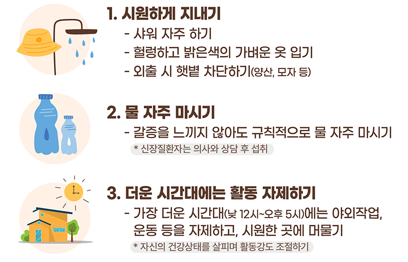 특히 무더위가 이어지는 여름철에는 갈증을 느끼지 않아도 자주 수분을 섭취하고 폭염 때 불가피하게 야외활동을 할 경우에는 챙 넓은 모자와 밝고 헐렁한 옷 등을 착용하는 것이 도움될 수 있다.