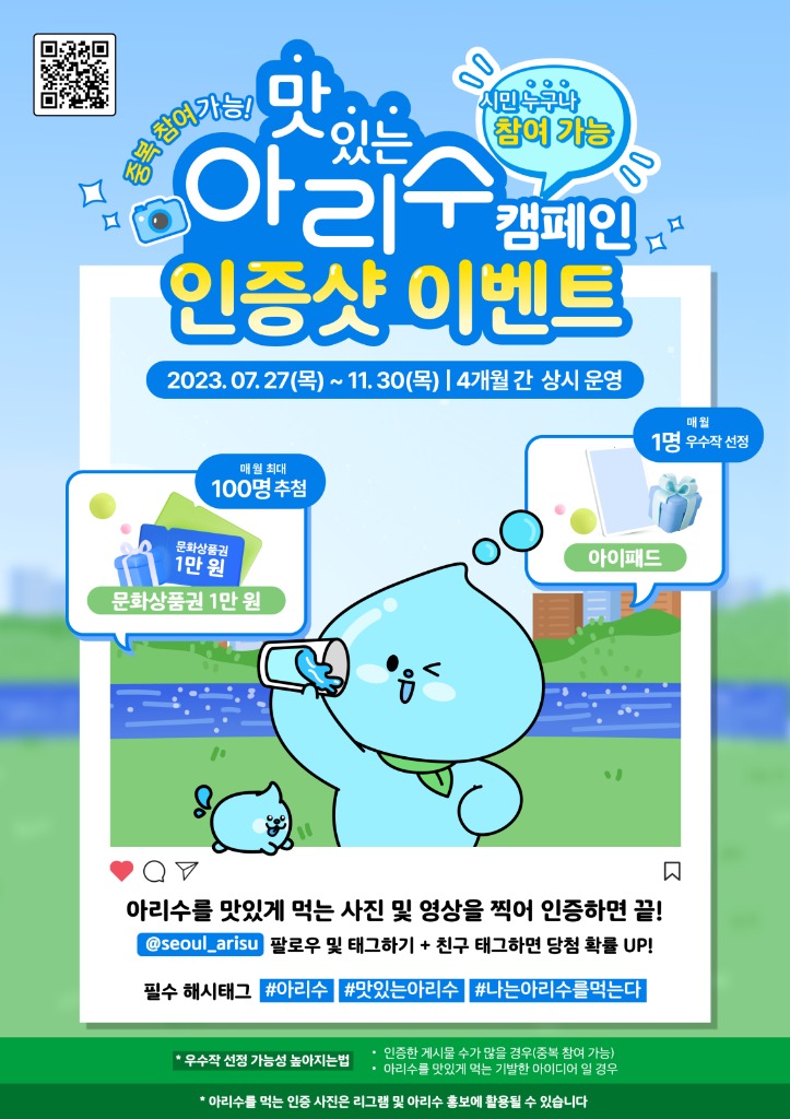 - 11월 말까지 시민 누구나 인스타그램에 아리수 먹는 모습 인증 이벤트, 매월 상품 증정