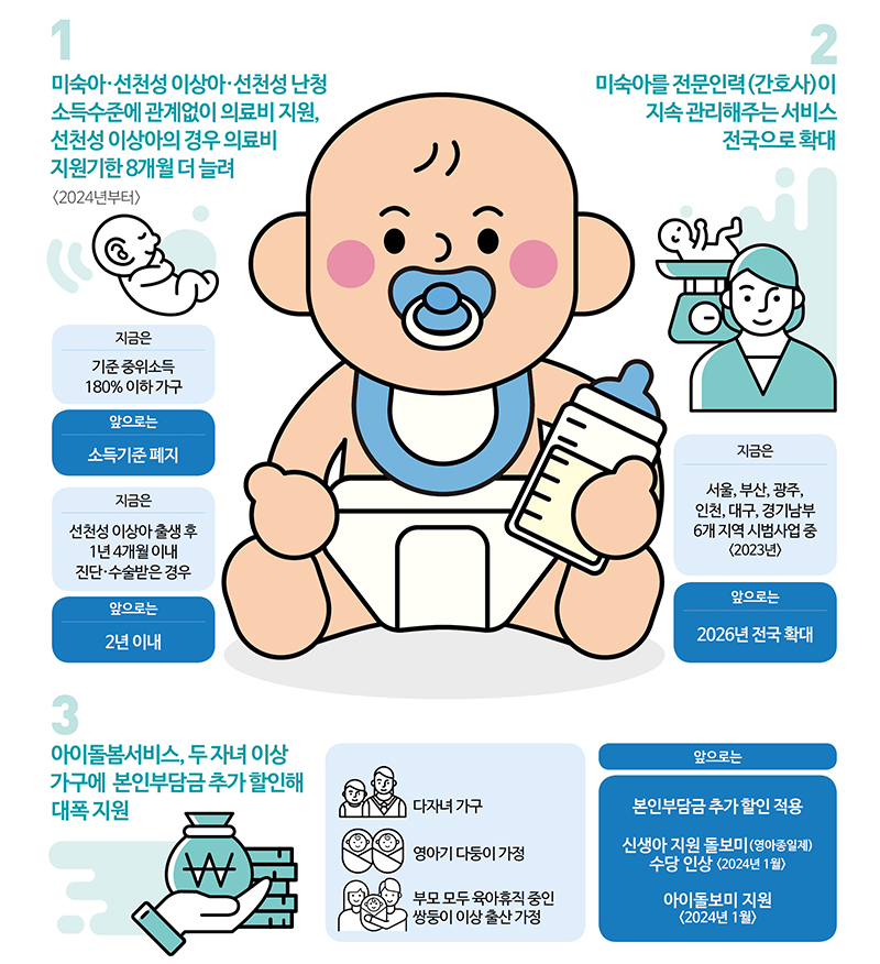 현재 서울 등 6개 지역에서 신생아집중치료실을 퇴원한 미숙아에게 전문인력을 배정해 건강상담 및 영아발달을 추적 관리하는 미숙아 지속관리 시범사업을 제공하고 있는데, 이를 2026년까지 전국으로 확대할 계획이다.