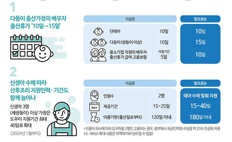 다둥이 임산부의 배우자 출산휴가 기간 또한 기존 10일에서 15일로 더 늘리고, 산후조리 도우미는 세쌍둥이 이상 가정에도 최대 2명에서 신생아 수에 맞춰 지원하기로 했다.