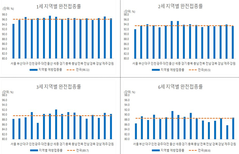 연령별로 구분해 살펴본 지역별 완전접종률은 1세 94.3~97.6%, 2세 92.0~95.5%, 3세 86.7~92.2%, 6세 85.8~91.6% 수준으로 분포하고 있다.