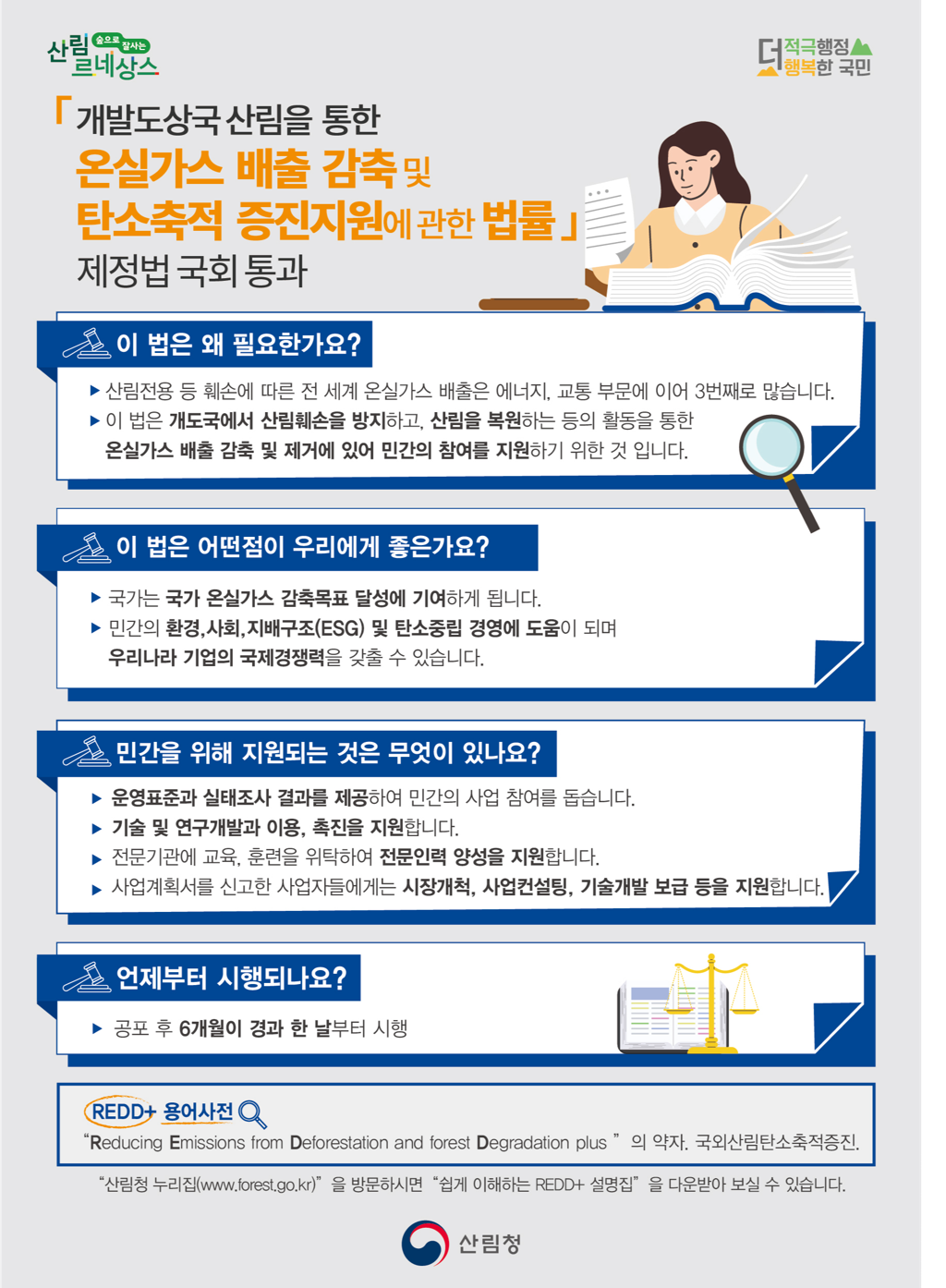이 법률은 개발도상국들의 제안으로 파리협약 제5조에 반영된 국외산림탄소배출감축사업(REDD+)을 정부 차원에서 체계적으로 진흥하기 위한 것이다. 국외산림탄소배출감축사업(REDD+)은 개발도상국의 산림전용과 황폐화를 막고 산림의 탄소흡수원 기능을 강화하여 탄소 배출을 저감하는 활동이다. 또한, 이 사업은 선진국의 재원 지원을 통해 개발도상국의 산림을 보호하고, 주민의 삶의 질을 개선하는 등의 성과를 기대할 수 있기 때문에 미국, 영국, 노르웨이, 일본 등 주요 선진국들과 브라질, 인도네시아, 콩고민주공화국 등 주요 열대림 국가들이 적극적으로 참여하고 있다.