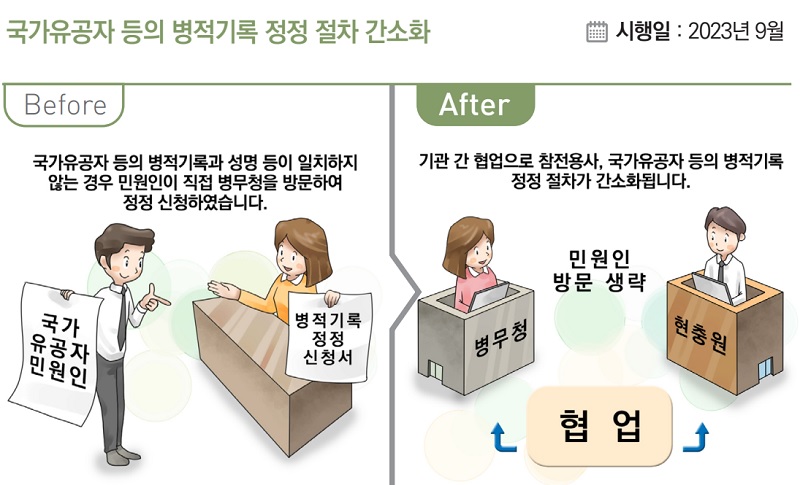 오는 9월부터는 민원인의 병무청 방문 없이 현충원 등 관련 기관으로부터 정정에 필요한 서류를 받아 병무청에서 직권으로 병적기록을 정정하게 된다.