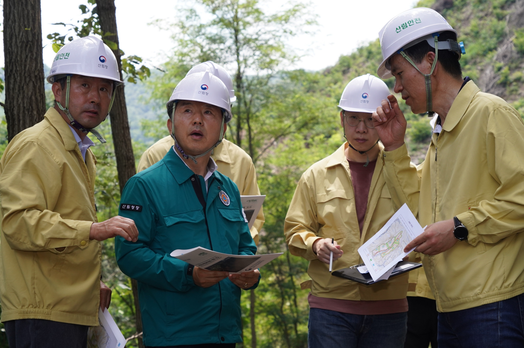 산림청 28일(금) 충청북도 보은군 내 국유림 목재수확 현장을 방문하여 집중호우에 대비한 안전점검을 실시하였다.