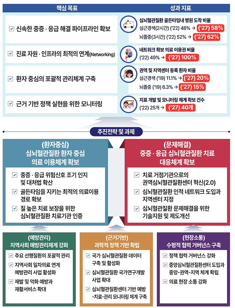 임상적 리더십 기반의 정책 지원을 위해 중앙심뇌혈관질환센터를 도입해 협력 기반의 심뇌혈관질환 중앙-권역-지역 전달체계를 확립하는데, 중앙센터는 올해 하반기에 지정 계획을 수립해 내년부터 운영한다.