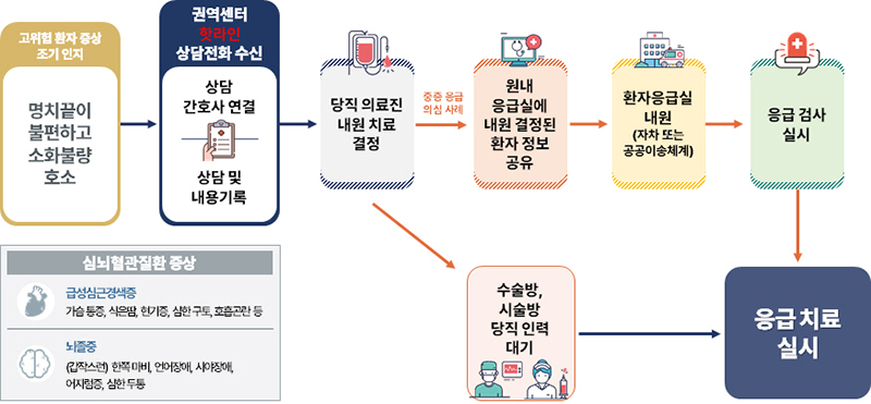 권역 및 지역 심뇌혈관질환센터를 통해 고위험군 환자 대상 핫라인을 운영, 신속한 내원 결정과 병원 방문 때 공공 이송 지원 등 골든타임 내 최적의 의료 이용 경로를 안내할 계획이다.