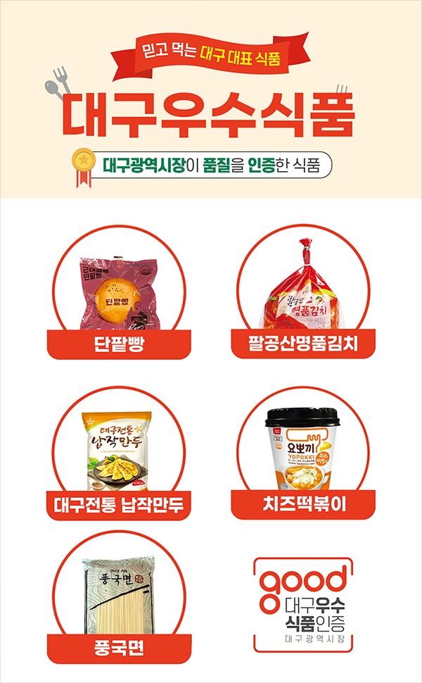 대구우수식품은 ‘㈜홍두당의 단팥빵, 영농조합법인 팔공김치의 팔공산명품김치, 농업회사법인 ㈜영풍의 치즈떡볶이, 성경순만두의 대구전통 납작만두, ㈜풍국면의 풍국면’ 5개 제품으로 ▲건강한 맛을 지향하는 단팥빵 ▲전통식품인 김치 ▲대표 간식인 떡볶이와 납작만두 ▲누구나 쉽게 먹을 수 있는 국수까지 ‘지역을 대표하는 대구의 다양한 식품’으로 인증된 바 있다.