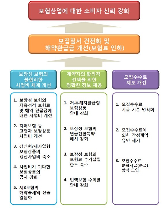 개편 방안은 크게 ▲보장성 보험의 불합리한 사업비 체계 개선 ▲모집 수수료 제도 개선 ▲정확한 정보 제공 등으로 구성됐다.