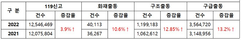화재출동 건수 또한 3846건(10.6%) 늘었고 구조출동 건수는 13만 6571건(12.85%), 구급출동 건수도 41만 5764건(13.2%) 증가한 것으로 집계됐다.