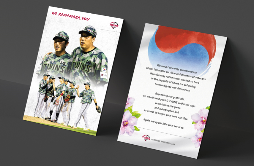 한편 LG트윈스는 지난 6월 “땡큐 솔저스데이” 행사와 더불어 6.25 참전 16개국 대사관에 감사편지와 16개국 국기가 부착된 밀리터리모자, 선수단 친필사인볼, <감사합니다,잊지않겠습니다>도서를 선물하며 다시한번 감사의 마음을 전할 예정이다.