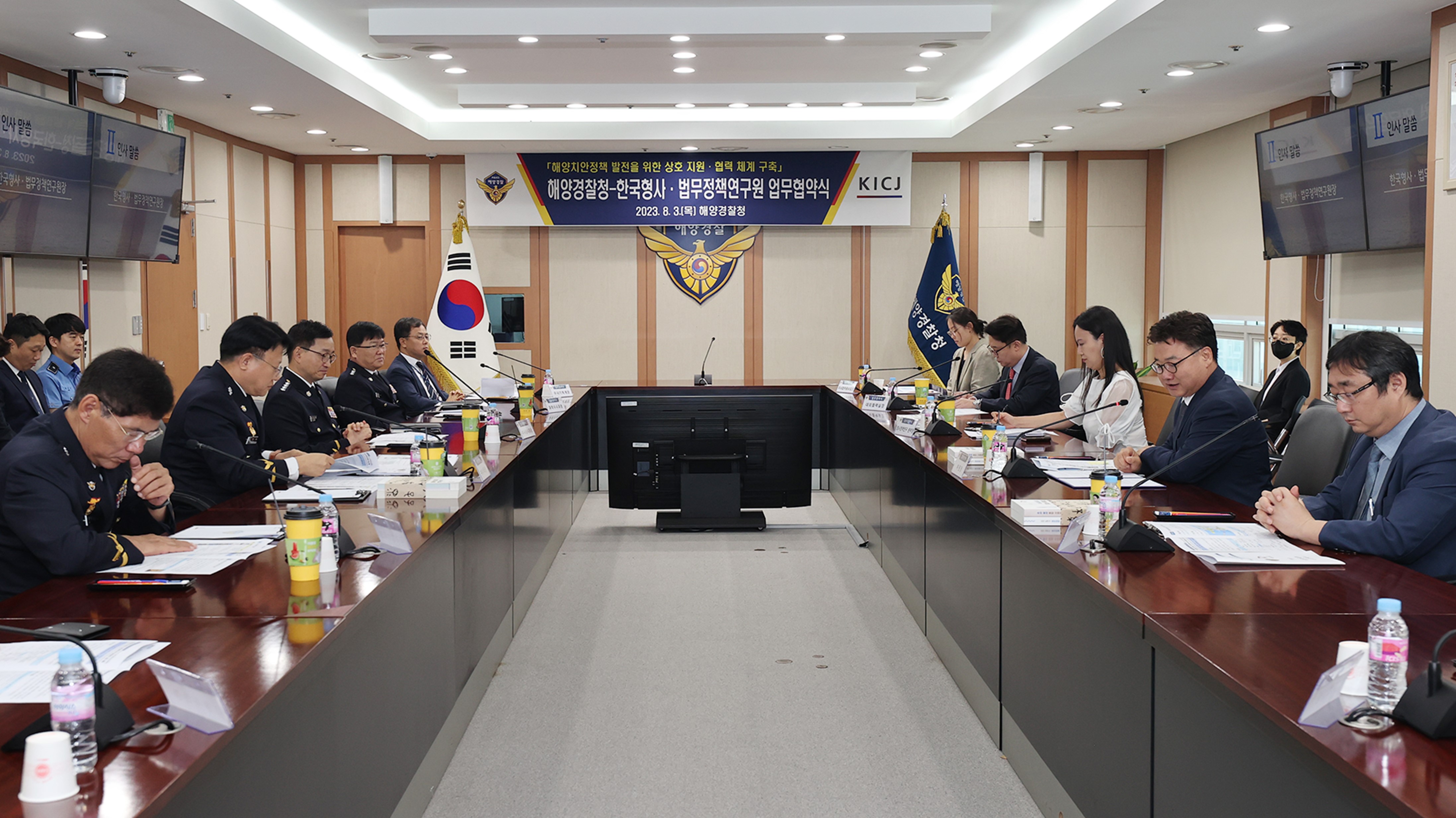 해양경찰청과 한국형사·법무 정책연구원은 청사 대회의실에서“업무협약을 체결하고 해양 치안 관련 정책 수립 연구 협력을 위한 다양한 의견을 교환했다.”고 3일 밝혔다.