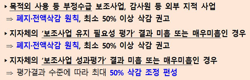 이에 따라 목적외 사용 등 부정수급 보조사업이나 감사원 등 외부 지적 사업은 폐지·전액삭감을 원칙으로 최소 50% 이상 삭감을 권고한다.