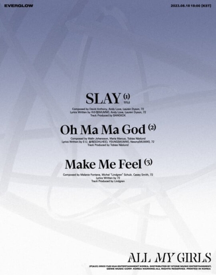 에버글로우(이유, 시현, 미아, 온다, 아샤, 이런)는 지난 3일 공식 SNS를 통해 네 번째 싱글 앨범 ‘ALL MY GIRLS (올 마이 걸스)’의 트랙리스트 이미지를 공개했다.