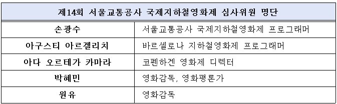 서울교통공사(이하 ‘공사’라고 함)는「제14회 서울교통공사 국제지하철영화제(이하 ‘국제지하철영화제’라고 함)」에 선보일 본선 진출작 45편을 공개했다고 밝혔다.