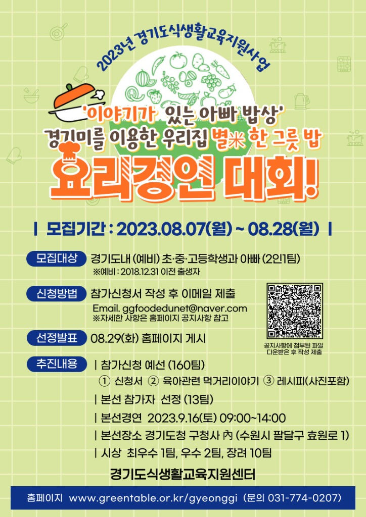 '이야기가 있는 아빠 밥상' 요리경연대회는 예선과 본선으로 구성하여 진행될 예정으로 경기미를 이용한 ‘우리집 별미(米) 한 그릇 밥’을 주제로 (예비)초․중․고등학생 자녀와 아빠가 한 팀이 되어 참가할 수 있다. 예선응모는 8월 7일부터 8월 28일까지다.