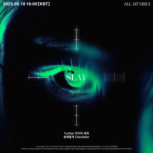 먼저 첫 번째 포스터에는 강렬한 초록색 눈동자 이미지와 함께 타이틀곡 'SLAY(슬레이)'의 가사 일부가 담겼다. "Further 미지의 세계 밝혀줄게 Chandelier"라는 가사를 통해 진취적이고 당당한 에버글로우만의 에너지를 느낄 수 있다.