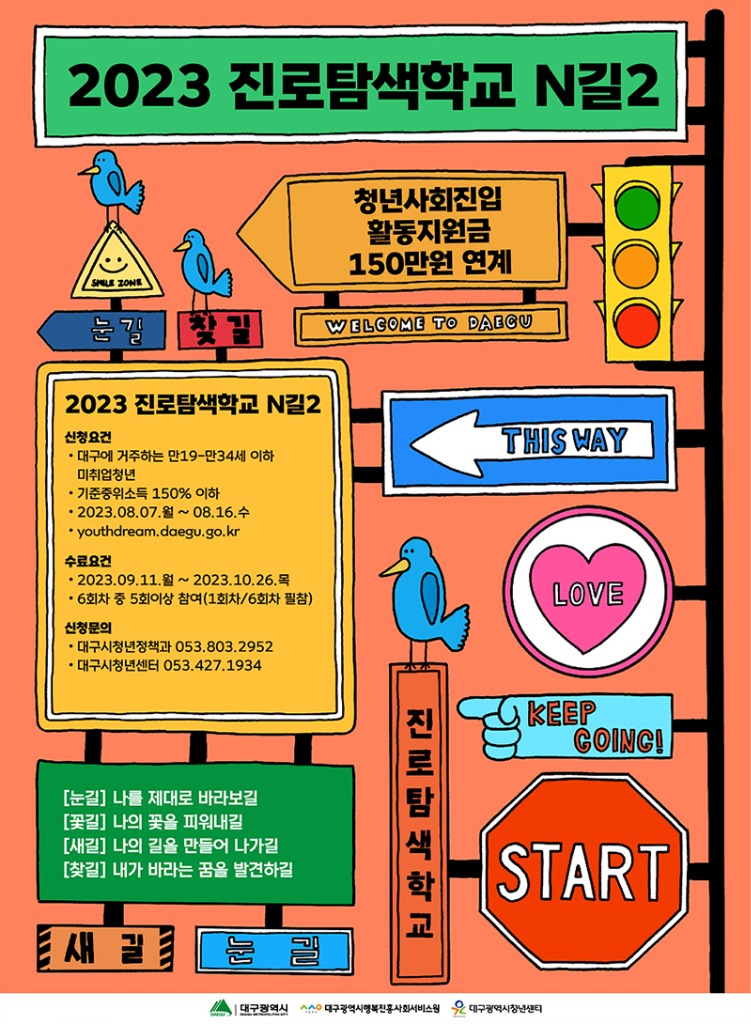 대구광역시와 대구광역시청년센터는 청년에게 진로탐색의 기회를 제공하는 ‘진로탐색학교 N길’에 참여할 청년들을 8월 7일(월)부터 16일(수)까지 모집한다.