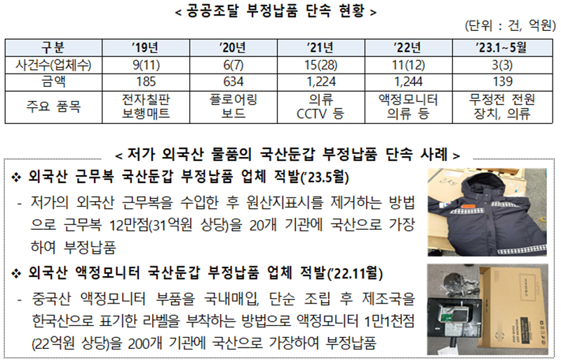저가 외국산 물품의 국산둔갑 부정납품 단속 사례를 보면, 저가의 외국산 근무복을 수입한 뒤 원산지표시를 제거하는 방법으로 근무복 12만 점(31억 원 상당)을 20개 기관에 국산으로 가장했다. 관세청은 부정납품한 업체를 지난 5월 적발했다.