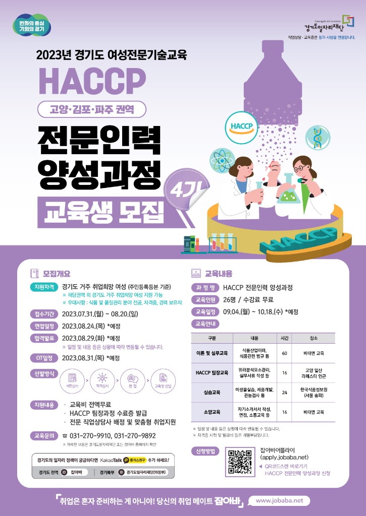 경기도가 여성의 경제활동 촉진을 위해 8월 20일까지 ‘식품안전관리인증기준(HACCP) 전문인력 양성과정’ 4기 교육생 26명을 모집한다.