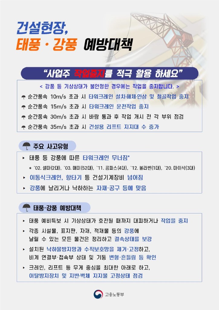 고용노동부는 태풍으로 인한 급박한 위험이 있는 경우 사업주 작업중지를 적극 실시해야 하고, ▲자재·적재물·표지판·공구 등의 강풍 피해(무너짐, 날림 등), ▲타워크레인·항타기 등 대형장비 전도, ▲굴착면·지하층 침수, ▲경사면·옹벽 등의 붕괴(산사태 등), ▲침수에 의한 감전 등에 대한 안전조치를 해야 한다고 당부했다.
