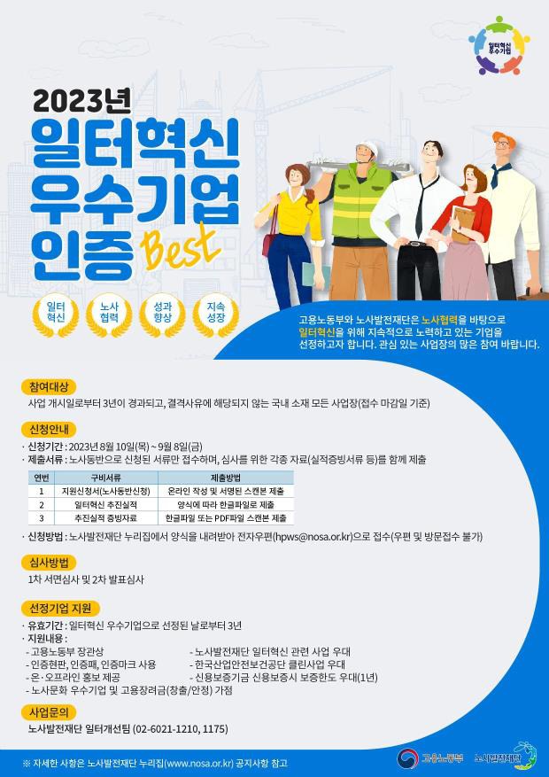 노사발전재단은 노사협력을 바탕으로 일터혁신을 위해 지속적으로 노력하고 있는 기업을 발굴·인증하여 일터혁신 문화를 확산하기 위해 8월 10일(목)부터 9월 8일(금)까지 30일간 ‘2023년 일터혁신 우수기업 인증’ 참여기업을 모집한다.