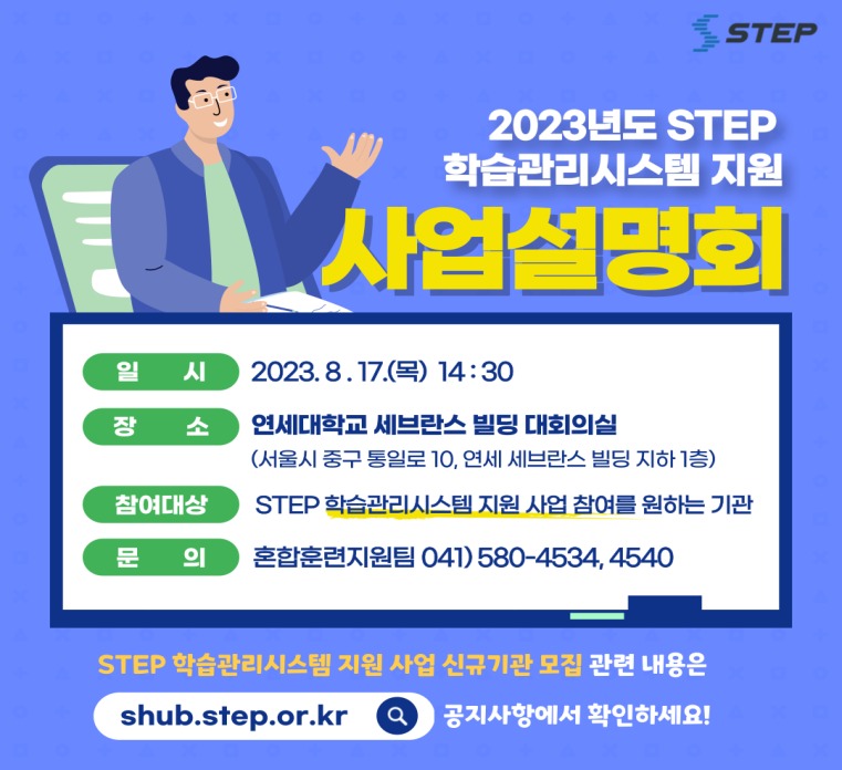 한국기술교육대학교 온라인평생교육원은 2023년 스텝(STEP) 학습관리시스템을 지원받을 신규 기관 모집을 앞두고 사업 참여 희망 기관을 대상으로 8월 17일(목) 서울 연세대학교 세브란스 빌딩 대회의실에서 사업설명회를 진행한다.