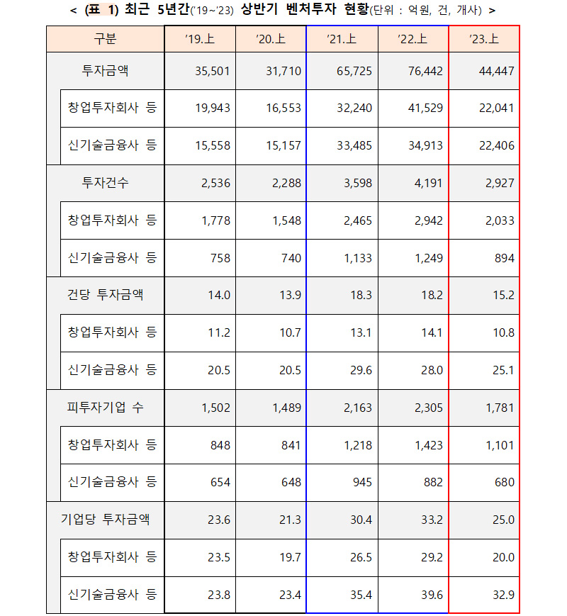 올해 상반기 벤처투자 실적 분석에 따르면, 유동성 확대 등에 따라 이례적으로 실적이 급증했던 2021년~2022년 상반기보다는 낮았으나 2019년~2020년 상반기 수준을 크게 넘어섰다.
