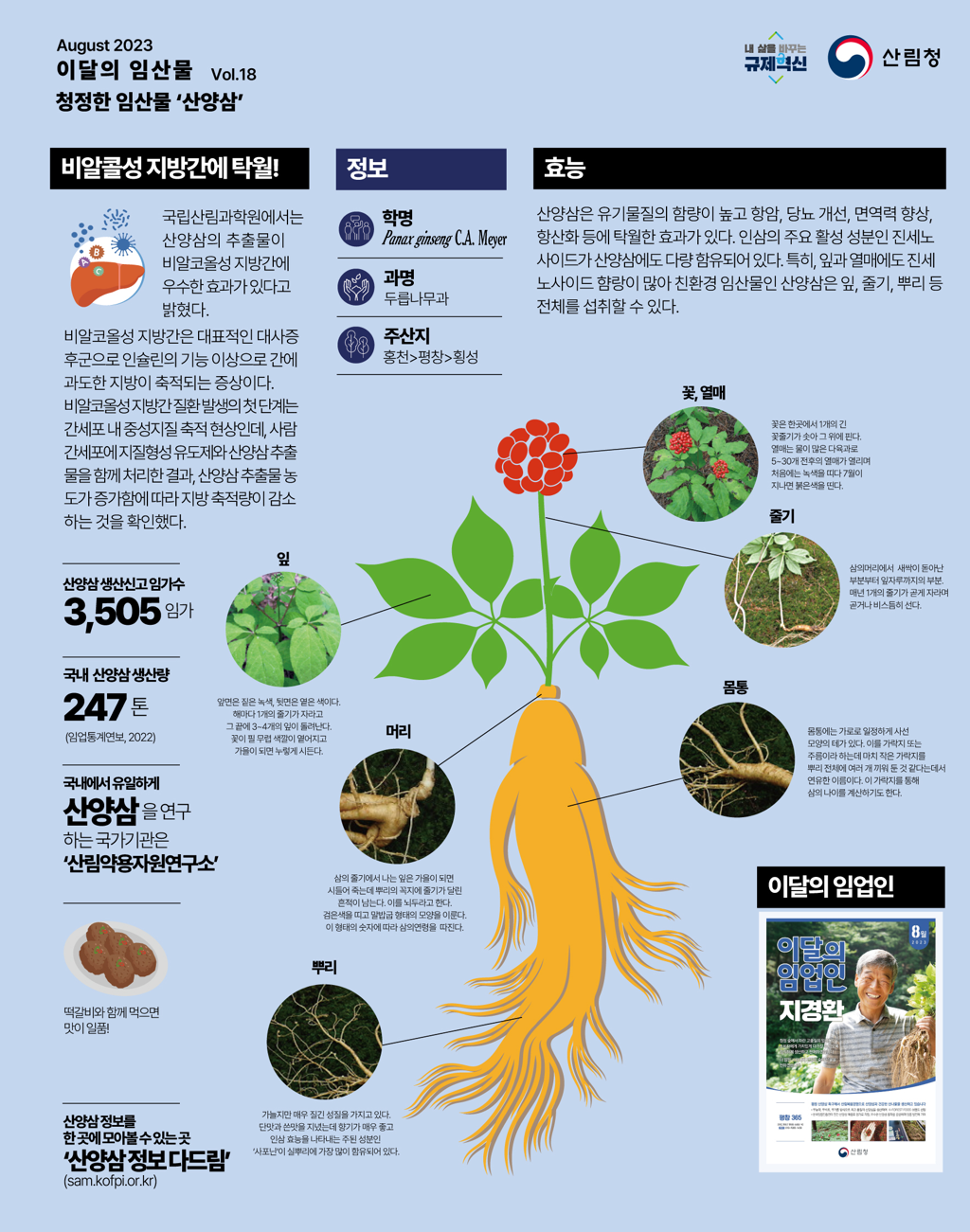 8월 이달의 임산물 주인공은 ‘산양삼’이다. 산양삼은 유기물질의 함량이 높고 항암, 당뇨 개선, 면역력 향상, 항산화 등에 탁월한 효과가 있어 많은 사람이 찾고 있다. 인삼의 주요 활성 성분인 진세노사이드가 산양삼에도 다량 함유되어 있다.