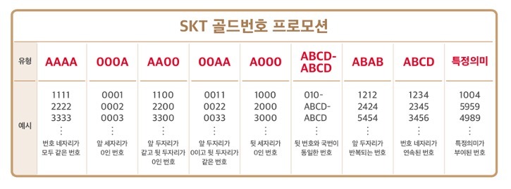 SK텔레콤이 올해 첫 골드번호 추첨을 시행한다. 이번에 공개된 골드번호는 9가지 유형으로 총 5천개다. 1인당 최대 3까지 원하는 번호를 신청할 수 있다.