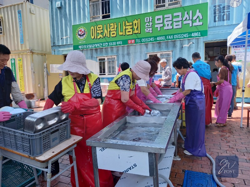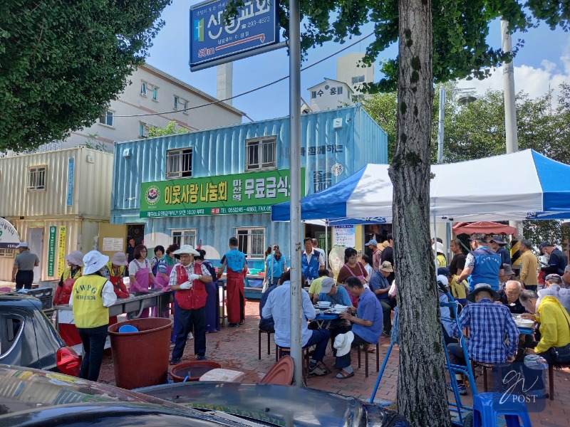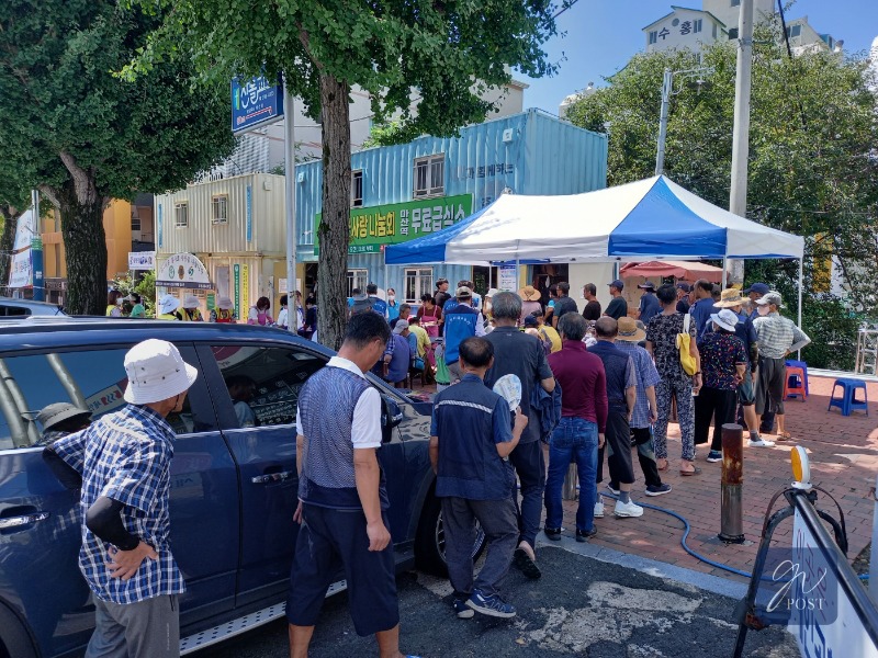 급식소는 배식 차례를 기다리는 긴 행렬과 봉사자들의 바쁜 손놀림이 쉴 새 없이 이어졌다.