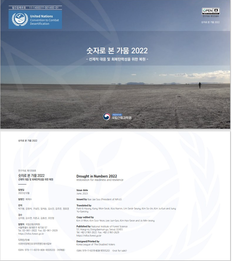 산림청 국립산림과학원은 2022년 UNCCD가 제15차 당사국총회(COP15)에서 발간한 ‘Drought in Numbers 2022’의 한글 번역본인 ‘숫자로 본 가뭄 2022’를 발간했다고 밝혔다.