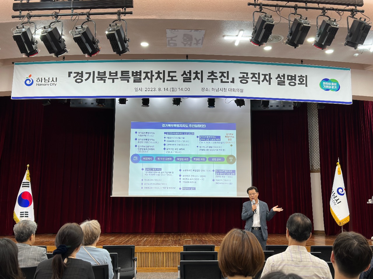 경기도가 14일 하남시청에서 하남시 공직자 100여 명이 참석한 가운데 ‘경기북부특별자치도 설치’ 설명회를 개최했다.