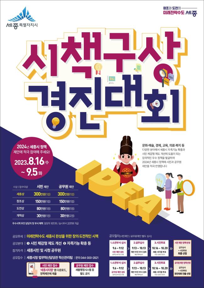 대회와 관련한 자세한 문의는 시 정책기획관(☎ 044-300-2113, 경진대회 관련), 법무혁신담당관(☎044-300-2821, 제안서 접수 관련)을 통해 가능하다.