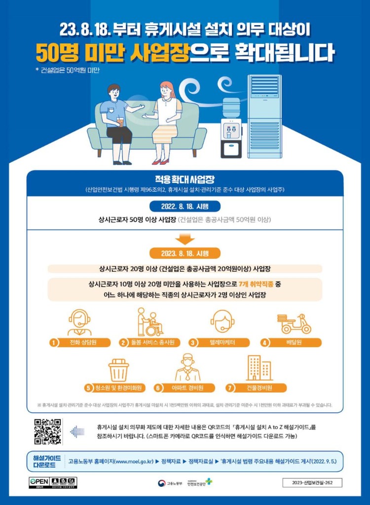 고용노동부는 8.16.(수) 10시, 6개 주요 업종별 협회와 8.18.부터 시행되는 50인 미만 사업장 휴게시설 설치 의무화에 따른 준비상황을 공유하고, 제도의 현장 안착방안을 논의했다.