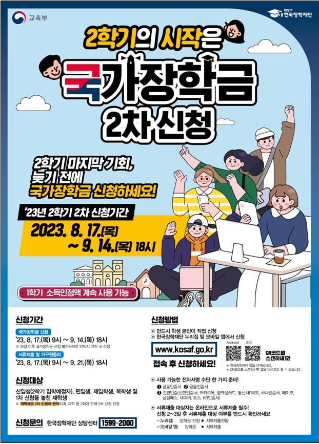 교육부와 한국장학재단은 오는 17일 오전 9시부터 다음 달 14일 오후 6시까지 2023학년도 2학기 2차 국가장학금 신청 접수를 진행한다고 16일 밝혔다.